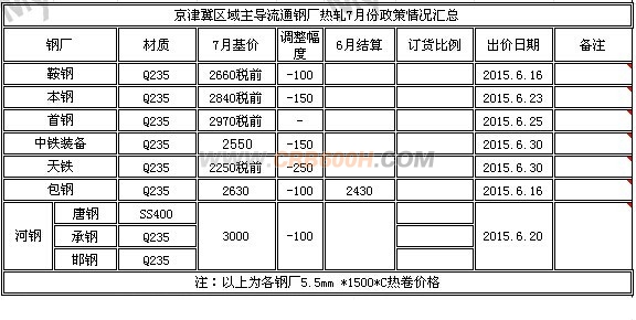 京津冀区域主导流通钢厂高线7月份政策情况汇总